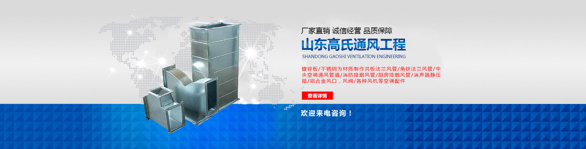山東高氏通風管道工程有限公司主要經營通風管,酒店廚房排煙罩酒、黑白鐵加工已有多年,主要從事通風管道設計、制作、安裝為一體的企業,風雨中我們在濟南的通風管道行業深受客戶的信賴,公司成立之初即確定一個高起點,公司擁有專用通風管生產線,各種設備齊全。 公司產品主要有,以鍍鋅板、不銹鋼為材質制作共板法蘭風管,角鐵法蘭風管,空調通風管道,消防排煙風管,廚房排煙風管,消聲器,靜壓箱,鋁合金風口,風閥,各種風機,等空調配件。 公司擁有高素質管理人員,業務素質高精、管理能力強,展望未來,任重而道遠,我們愿與各業同仁一道,相互進步,共同發展,服務回饋社會,...